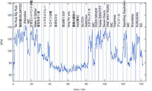 NO RULE MY RULE ツアーは気合としては全通したかったのだけど,水樹先生の甲子園ライブがあったので仙台だけは断念。 9/17 愛知 名古屋ボトムライン 9/18 大阪 梅田CLUB QUATTRO 10/2 福岡 DRUM Be-1 10/22 東京 新木場STUDIO COAST 心拍数を並べると以下の…